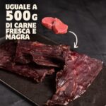 Un solo pezzo racchiude l’equivalente di 500g di carne fresca magra, concentrata in un taglio che sprigiona aroma e soddisfazione ad ogni morso. Senza conservanti né coloranti, gluten free e con pochi zuccheri: pura energia proteica in versione italiana.